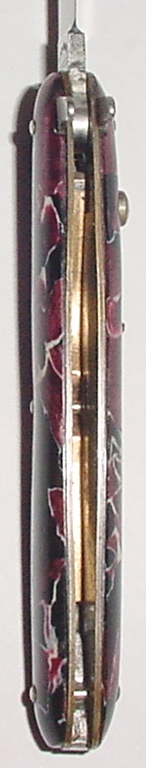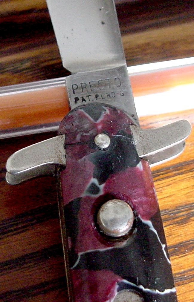 Single-blade equal-end shadow jack knife 3-1/8 inches long closed. Fancy celluloid handles.Clip blade tang stamped G. SCHRADE arched / B'PORT CT. on the reverse side, and on the obverse side PRESTO / PAT. PEND-G