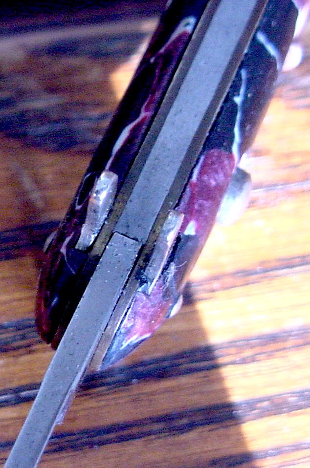 The pivot rivet secures the guards to the knife. Notches in the handles hold the guards rigidly in position.