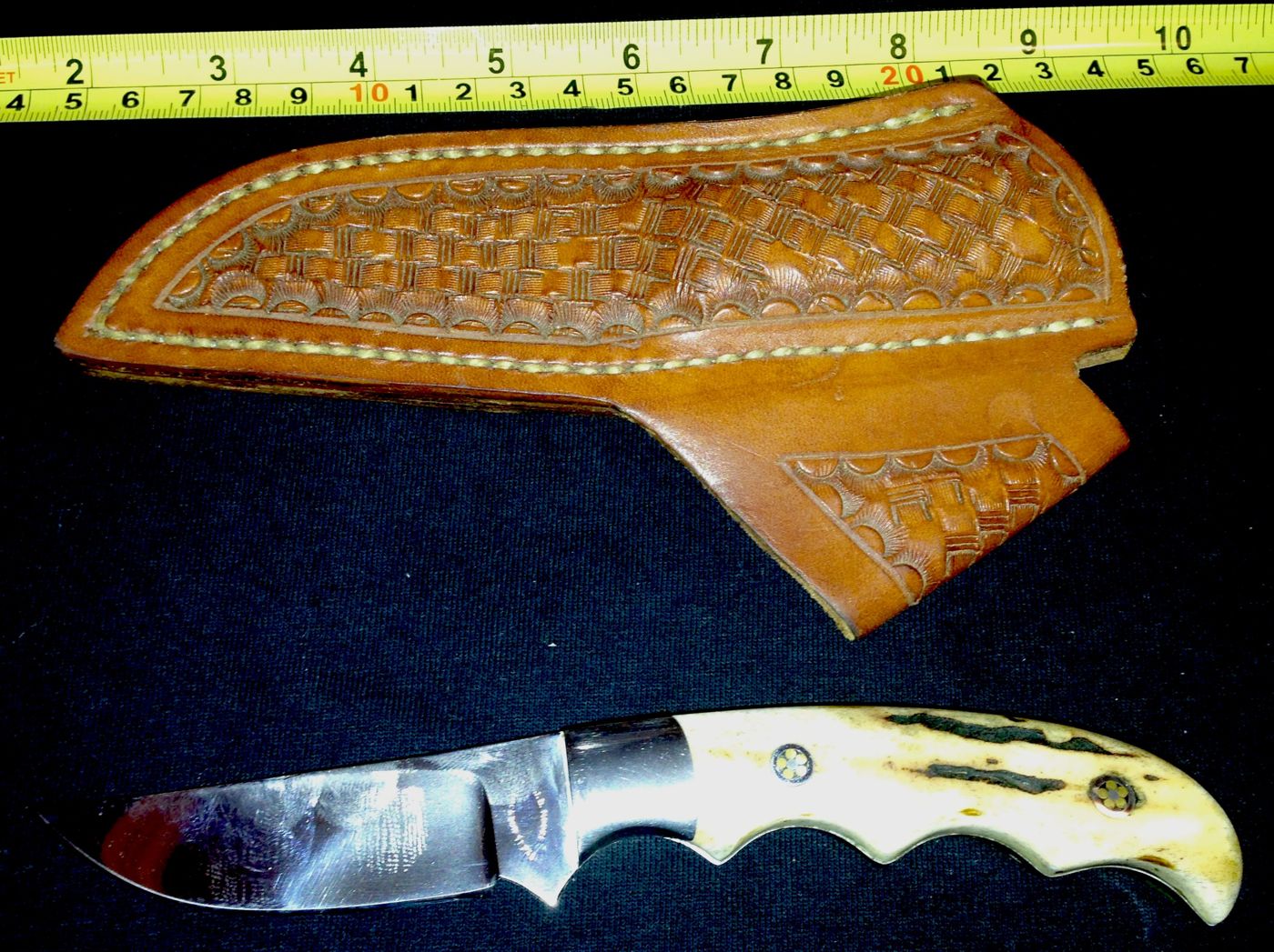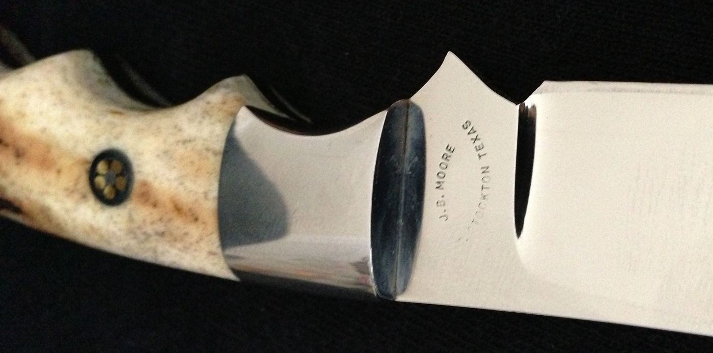 J. B. Moore began making knives in 1974. He learned from R. W. Wilson.Deluxe hunting knife, mirror polished hollow ground blade. See photos for dimensions.