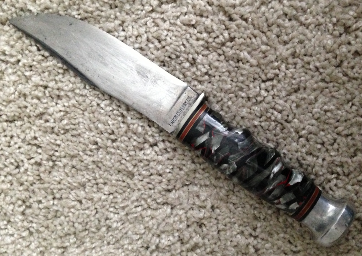 4-1/2 inch flat ground blade with long shallow clip.KA-BAR on obverse ricasso. On reverse: UNION CUTLERY CO./ OLEAN, N.Y.