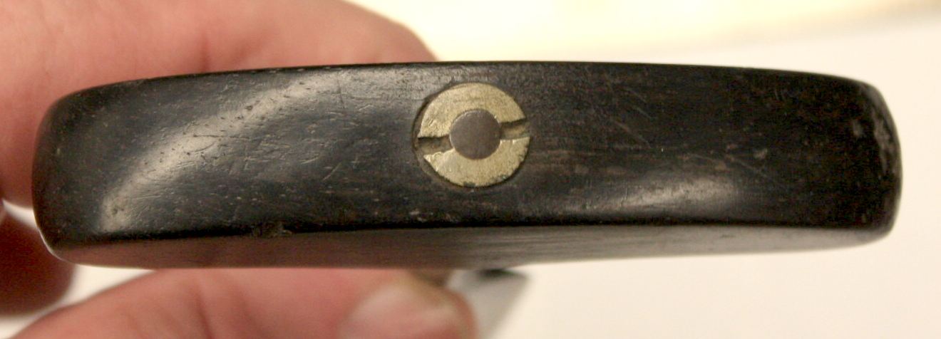 Forged blade, flat ebony(?) or rosewood handle, nickel silver barrel nut. Not quite 6 inches long.Stitched leather body scabbard, nickel silver throat and tip. Belt loop on throat. Fancy finial on tip.