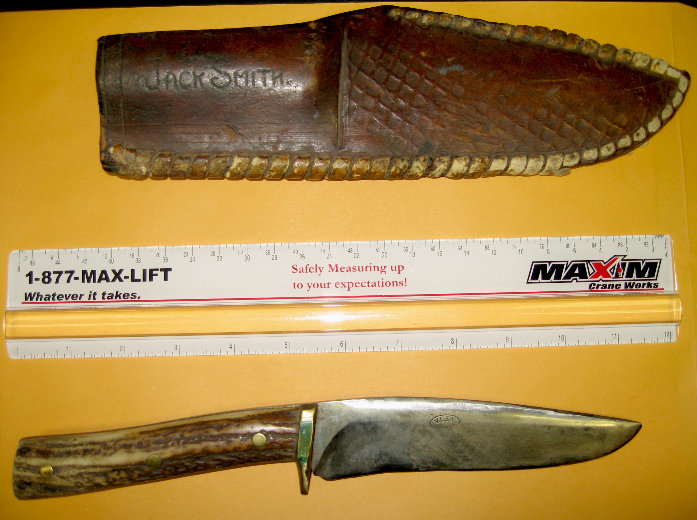 The owner recounts: The knife was given to me by an old Cowboy friend here in Arizona... the name on the sheath, Jack Smith, is not the name of my Cowboy friend who presented me with this knife. This knife, along with a Civil War Merrill .54 cal. Civil War Carbine was found by my friend resting in the crook of a Juniper Tree here in Central Arizona just above Camp Verde (Fort Verde) Arizona many years ago while he was out riding the range herding cattle on horseback.
