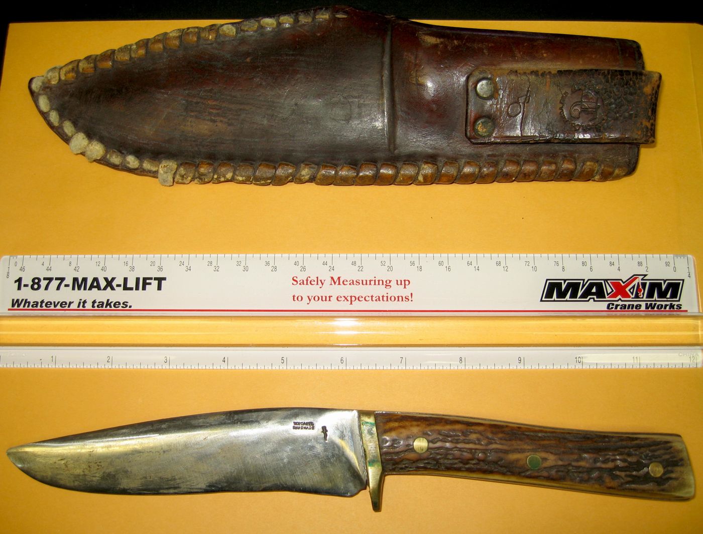 W. SCAGEL / HAND MADE Knife about 1 foot long. 1/4 inch thick blade. Stag scales. Brass guard and pins.Reverse of blade stamped V. L. & A. / CHICAGO in an oval (Von Lengerke & Antoine).