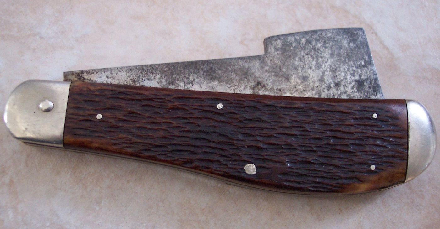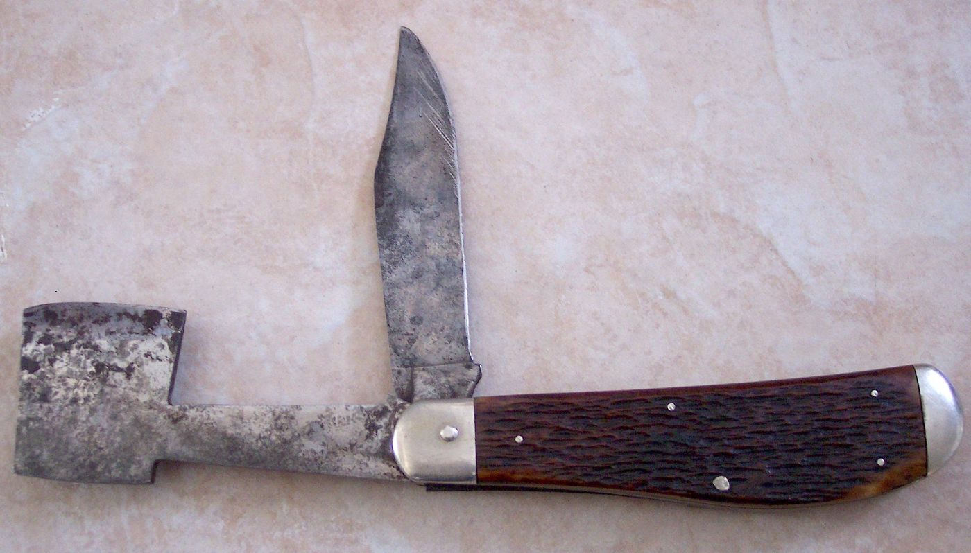Two-blade folding hunter: flat-ground clip blade, hatchet blade
